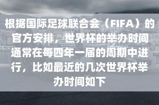 根据国际足球联合会(FIFA)的官方安排,世界杯的举办时间通常在每四年一届的周期中进行,比如最近的几次世界杯举办时间如下