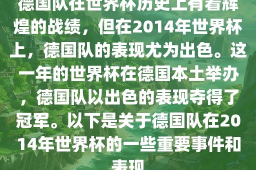 德国队在世界杯历史上有着辉煌的战绩,但在2014年世界杯上,德国队的表现尤为出色。这一年的世界杯在德国本土举办,德国队以出色的表现夺得了冠军。以下是关于德国队在2014年世界杯的一些重要事件和表现