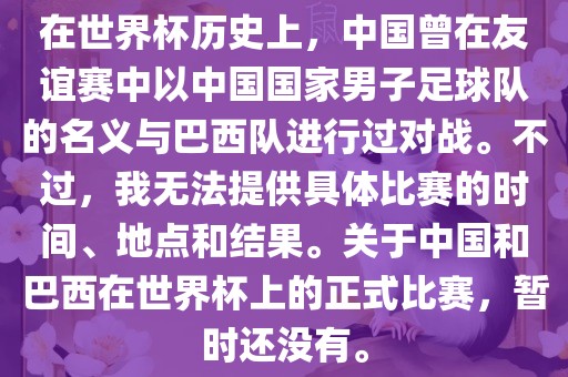 在世界杯历史上,中国曾在友谊赛中以中国国家男子足球队的名义与巴西队进行过对战。不过,我无法提供具体比赛的时间、地点和结果。关于中国和巴西在世界杯上的正式比赛,暂时还没有。
