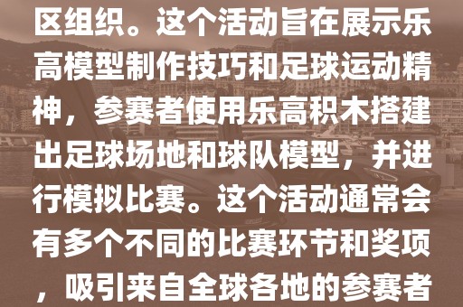 具体的活动安排和规则可能会因组织者和年份而异,建议关注相关社区或官方渠道以获取最新信息,乐高公司本身也可能推出与足球或世界杯相关的乐高套装或模型,供爱好者们收藏和展示。