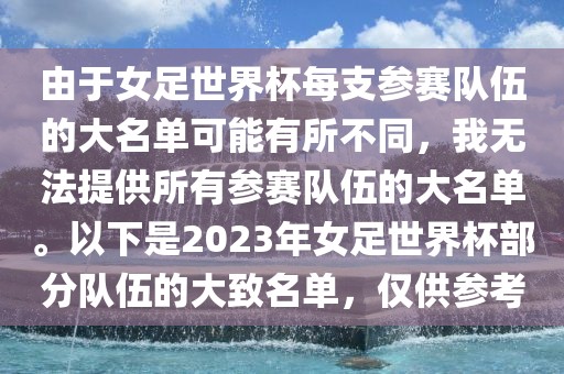 摘要:以下是2023年女足世界杯部分参赛队伍的大致名单。由于各队大名单可能有所不同,这里仅提供部分队伍的参考名单。具体名单可能会有所变动,请关注官方消息。