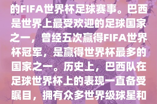 巴西足球世界杯是指巴西举办的FIFA世界杯足球赛事。巴西是世界上最受欢迎的足球国家之一,曾经五次赢得FIFA世界杯冠军,是赢得世界杯最多的国家之一。历史上,巴西队在足球世界杯上的表现一直备受瞩目,拥有众多世界级球星和精彩比赛瞬间。