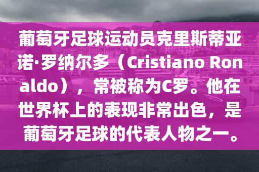 葡萄牙足球运动员克里斯蒂亚诺·罗纳尔多(Cristiano Ronaldo),常被称为C罗。他在世界杯上的表现非常出色,是葡萄牙足球的代表人物之一。