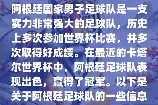 阿根廷足球队在世界杯历史上有着辉煌的战绩,曾参加过多次世界杯比赛,并多次进入决赛,阿根廷足球队在世界杯历史上拥有多个经典比赛和精彩瞬间,如马拉多纳的神奇表现等,在卡塔尔世界杯中,阿根廷足球队的表现备受瞩目,球队在比赛中展现出了强大的实力和精湛的技艺,最终成功夺冠,球队的核心球员梅西在比赛中表现出色,成为球队的关键人物之一,阿根廷足球队在卡塔尔世界杯中还展现出了年轻球员的潜力和实力,为未来的比赛打下了坚实的基础。