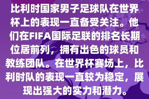 比利时国家男子足球队在世界杯上是一支备受关注的球队,他们拥有强大的实力和潜力,始终在比赛中展现出出色的表现,他们仍将是世界杯赛场上的重要竞争者之一。