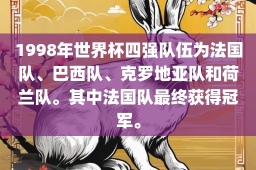 1998年世界杯四强队伍为法国队、巴西队、克罗地亚队和荷兰队。其中法国队最终获得冠军。
