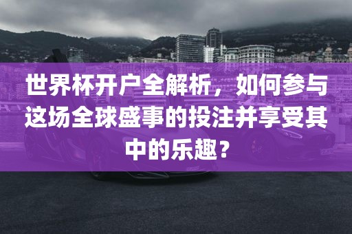 随着世界杯足球赛的临近,全球的球迷和投资者都在跃跃欲试,想要参与这场盛事的投注,作为一个自媒体作者,今天我将为大家带来世界杯开户的全面解析,帮助大家了解如何参与世界杯投注并享受其中的乐趣。