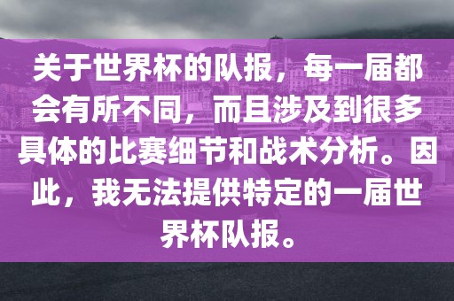 关于世界杯的队报,每一届都会有所不同,而且涉及到很多具体的比赛细节和战术分析。因此,我无法提供特定的一届世界杯队报。
