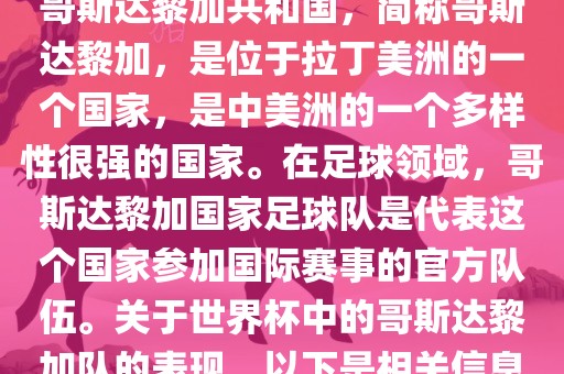 哥斯达黎加共和国,简称哥斯达黎加,是位于拉丁美洲的一个国家,是中美洲的一个多样性很强的国家。在足球领域,哥斯达黎加国家足球队是代表这个国家参加国际赛事的官方队伍。关于世界杯中的哥斯达黎加队的表现,以下是相关信息