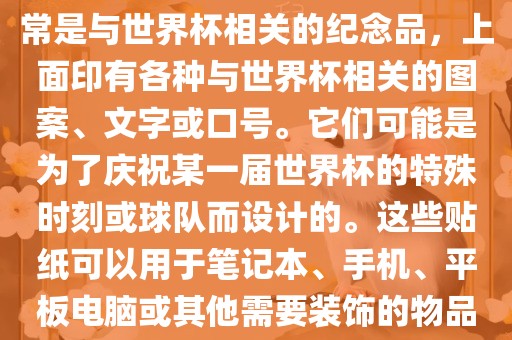 如果您正在寻找关于特定世界杯主题贴纸的信息,例如某一届世界杯的官方主题贴纸,您可以通过以下途径获取: