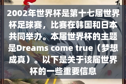 摘要:2002年世界杯足球赛是第十七届比赛,在韩国和日本共同举办,主题为Dreams come true。该届世界杯见证了众多精彩比赛和难忘的瞬间,同时也留下了许多重要信息,成为世界杯历史上的一个重要篇章。