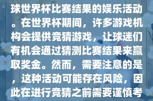 世界杯竞猜游戏是一种有趣的娱乐方式,但需要谨慎参与,遵守法律法规和游戏机构的规定,保持理性和冷静的态度。