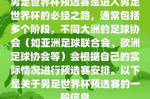 男足世界杯预选赛是进入男足世界杯的必经之路,通常包括多个阶段,不同大洲的足球协会(如亚洲足球联合会、欧洲足球协会等)会根据自己的实际情况进行预选赛安排。以下是关于男足世界杯预选赛的一般信息