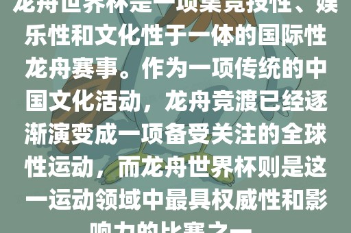 龙舟世界杯是一项重要的国际性龙舟赛事,旨在推广和发展全球龙舟运动,同时也是展示中国传统文化的重要窗口,通过这一赛事,世界各地的龙舟队伍和爱好者得以相聚,共同推动龙舟运动的发展,增进不同文化之间的交流与理解。