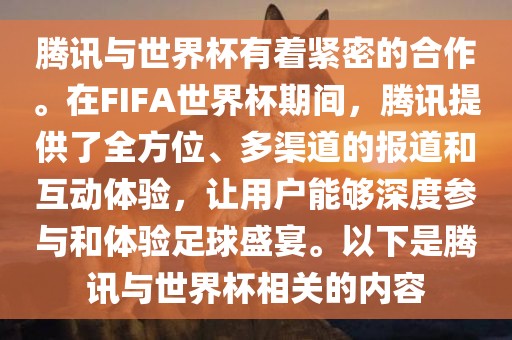 腾讯与世界杯有着紧密的合作。在FIFA世界杯期间,腾讯提供了全方位、多渠道的报道和互动体验,让用户能够深度参与和体验足球盛宴。以下是腾讯与世界杯相关的内容