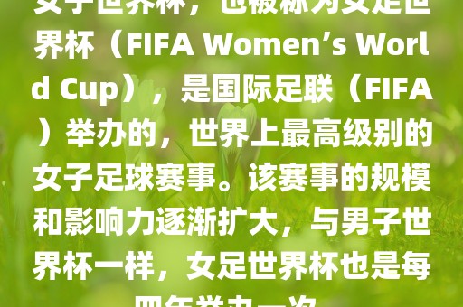 女子世界杯,也被称为女足世界杯(FIFA Women’s World Cup),是国际足联(FIFA)举办的,世界上最高级别的女子足球赛事。该赛事的规模和影响力逐渐扩大,与男子世界杯一样,女足世界杯也是每四年举办一次。