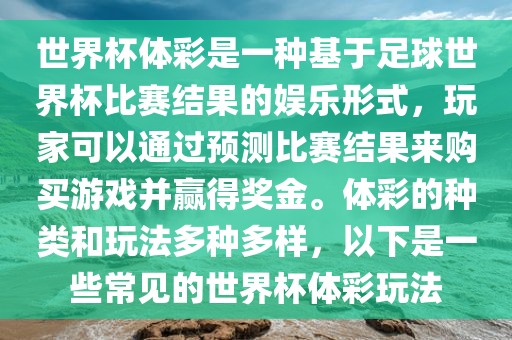 世界杯体彩是一种基于足球世界杯比赛结果的娱乐形式,玩家可以通过预测比赛结果来购买游戏并赢得奖金。体彩的种类和玩法多种多样,以下是一些常见的世界杯体彩玩法