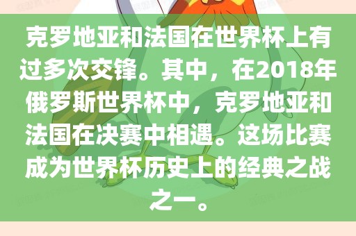 克罗地亚和法国在世界杯上有过多次交锋。其中,在2018年俄罗斯世界杯中,克罗地亚和法国在决赛中相遇。这场比赛成为世界杯历史上的经典之战之一。