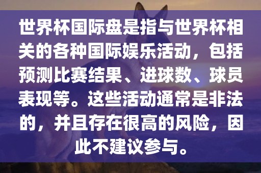 世界杯国际盘是指与世界杯相关的各种国际娱乐活动,包括预测比赛结果、进球数、球员表现等。这些活动通常是非法的,并且存在很高的风险,因此不建议参与。