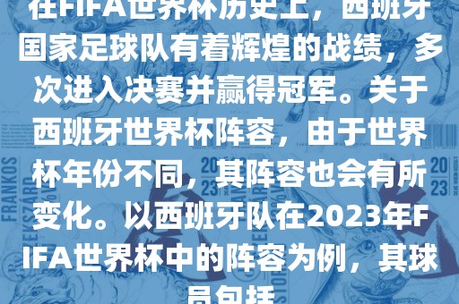 在FIFA世界杯历史上,西班牙国家足球队有着辉煌的战绩,多次进入决赛并赢得冠军。关于西班牙世界杯阵容,由于世界杯年份不同,其阵容也会有所变化。以西班牙队在2023年FIFA世界杯中的阵容为例,其球员包括