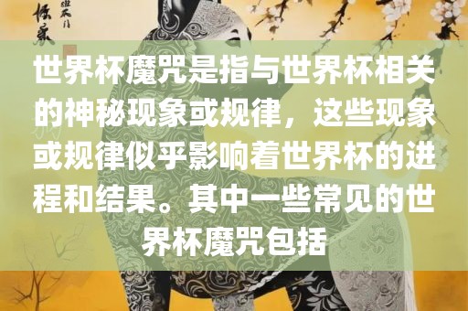 世界杯魔咒是指与世界杯相关的神秘现象或规律,这些现象或规律似乎影响着世界杯的进程和结果。其中一些常见的世界杯魔咒包括
